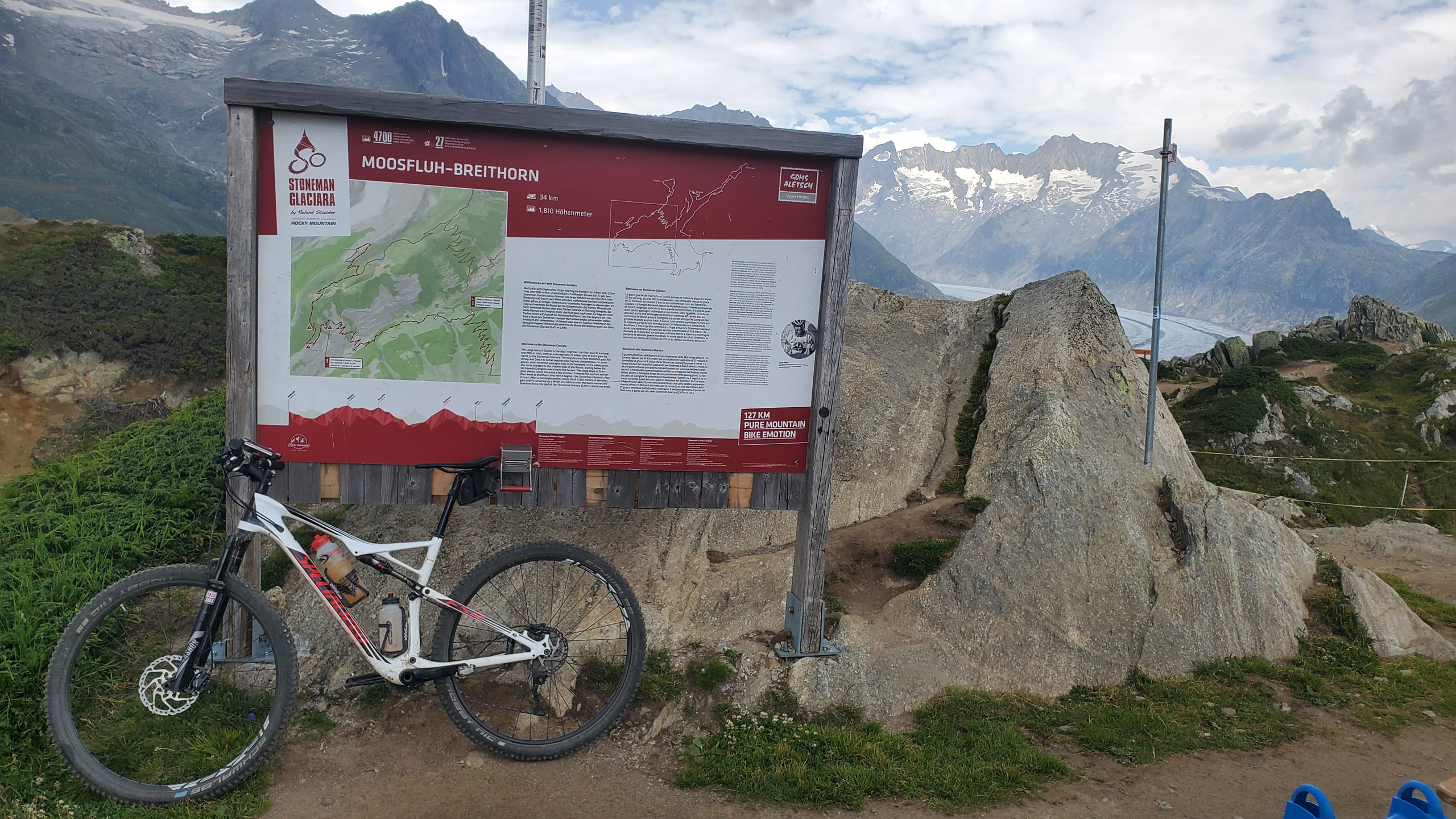 Diese Stück ist landschaftlich und vom Blick auf dem Alteschgletscher sehr schön, fahren konnte man hier allerdings nicht mehr. So musste man ca. 30 min schieben, bzw. das Fahrrad tragen. Normalerweise führt der Weg zur Stempelstelle an der Bergstation einen Schotterweg hinauf, dieser war aber gesperrt. Egal, die 6 Stempel waren geholt!